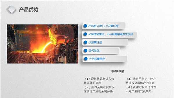 我司是研發(fā)、生產(chǎn)鑄造專用高溫陶瓷澆道管、橫澆道、直澆道、內(nèi)澆道、澆口杯、過濾座等系列產(chǎn)品的高科技企業(yè),耐火陶瓷管產(chǎn)品性能在行業(yè)中處于領(lǐng)先地位,填補(bǔ)了國內(nèi)空白,是提高鑄件內(nèi)在質(zhì)量的必備輔助材料。在中國是核電、高鐵及跨國大型鑄造集團(tuán)指定耐火澆道供應(yīng)商。經(jīng)過應(yīng)流股份(603308)、中車集團(tuán)株洲電力機(jī)車有限公司、中車集團(tuán)長江車輛有限公司銅陵分公司,株洲斯威鐵路產(chǎn)品有限公司、泰鋼合金(深圳)、Metso Outotec、andritz、江蘇神通閥門股份有限公司等數(shù)十家集團(tuán)企業(yè)的使用,一致認(rèn)為該系列產(chǎn)品能有效提高鑄件質(zhì)量。特別是對檢測手段嚴(yán)格的高端鑄件質(zhì)量提高明顯。廣泛用于高端鑄造企業(yè)生產(chǎn)核電、礦機(jī)、高鐵、風(fēng)電等高端鑄件。
